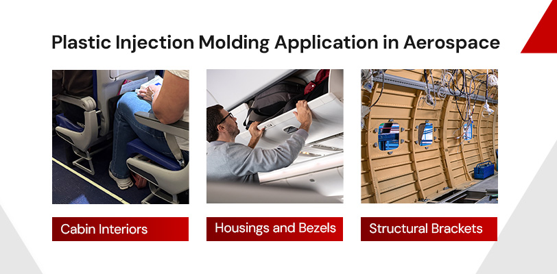 À l'instar de l'industrie automobile, le secteur aérospatial recourt au moulage par injection de plastique pour réduire le poids sans compromettre la sécurité. Les intérieurs des avions comportent de nombreux composants moulés qui répondent à des normes strictes en matière d'inflammabilité et de toxicité des fumées. Parmi ceux-ci, on peut citer :